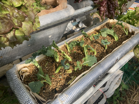 ハウス内には、プランターの水耕栽培でスナップエンドウ、サニーレタス、キャベツ、ミニトマトを育てています。また、土耕栽培では、ブロッコリー、ソラマメ、パブリカを育てています。